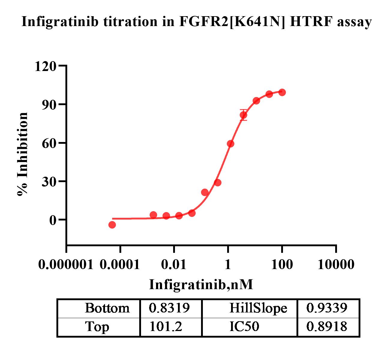 Activity Identification:The FGFR2[K641N] activity was detected using HTRF technology. The reaction was performed by incubating the FGFR2[K641N] protein, ATP and substrate at 25℃ for 60 min, adding the beads at 25℃ for 60 min, then reading ratio 665/620 with BMG.