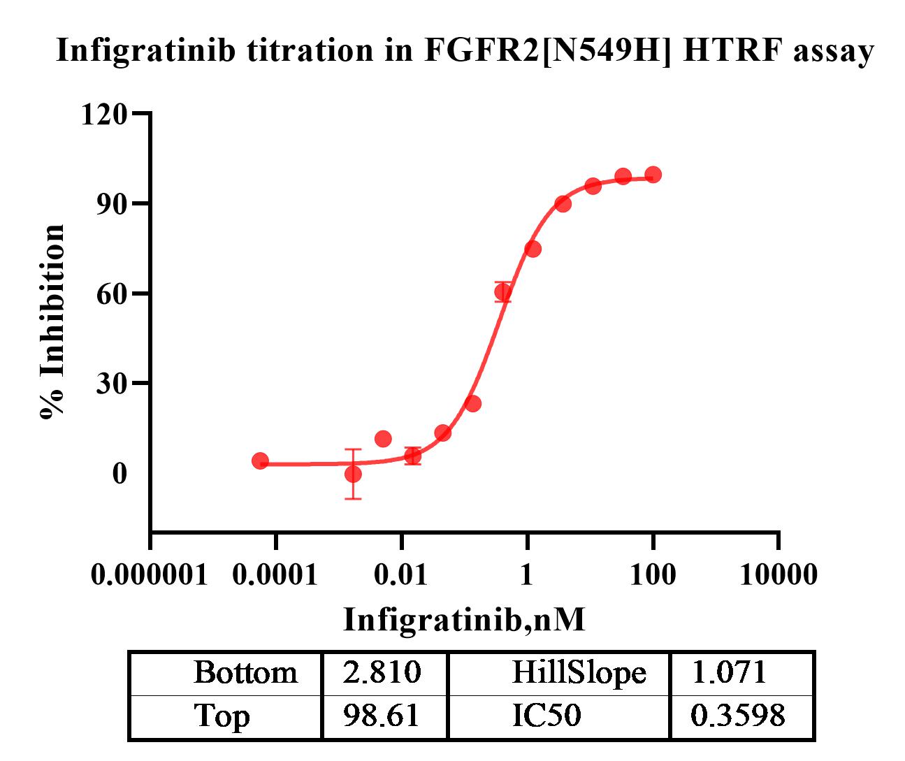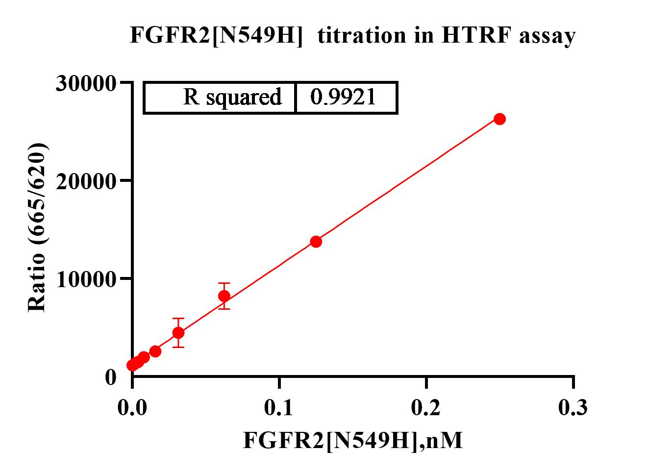 Activity Identification:The FGFR2[N549H] activity was detected using HTRF technology. The reaction was performed by incubating the FGFR2[N549H] protein, ATP and substrate at 25℃ for 60 min, adding the beads at 25℃ for 60 min, then reading ratio 665/620 with BMG.