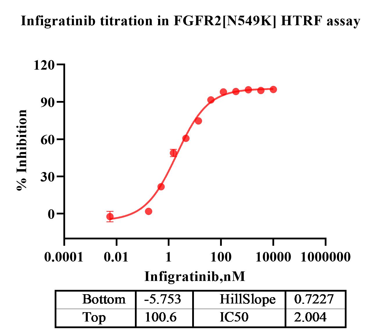 Activity Identification:The FGFR2[N549K] activity was detected using HTRF technology. The reaction was performed by incubating the FGFR2[N549K] protein, ATP and substrate at 25℃ for 60 min, adding the beads at 25℃ for 60 min, then reading ratio 665/620 with BMG.