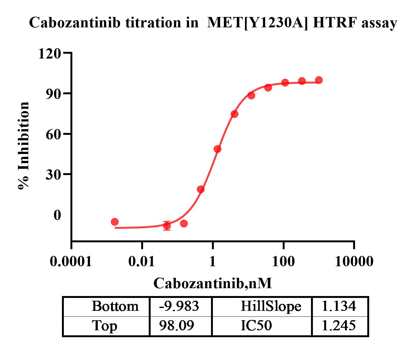 Activity Identification:The MET[Y1230A] activity was detected using HTRF technology. The reaction was performed by incubating the MET[Y1230A] protein, ATP and substrate at 25℃ for 60 min, adding the beads at 25℃ for 60 min, then reading ratio 665/620 with BMG.