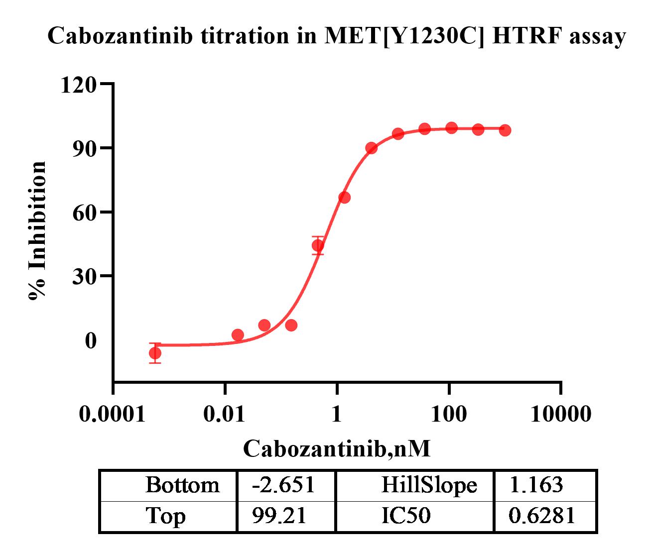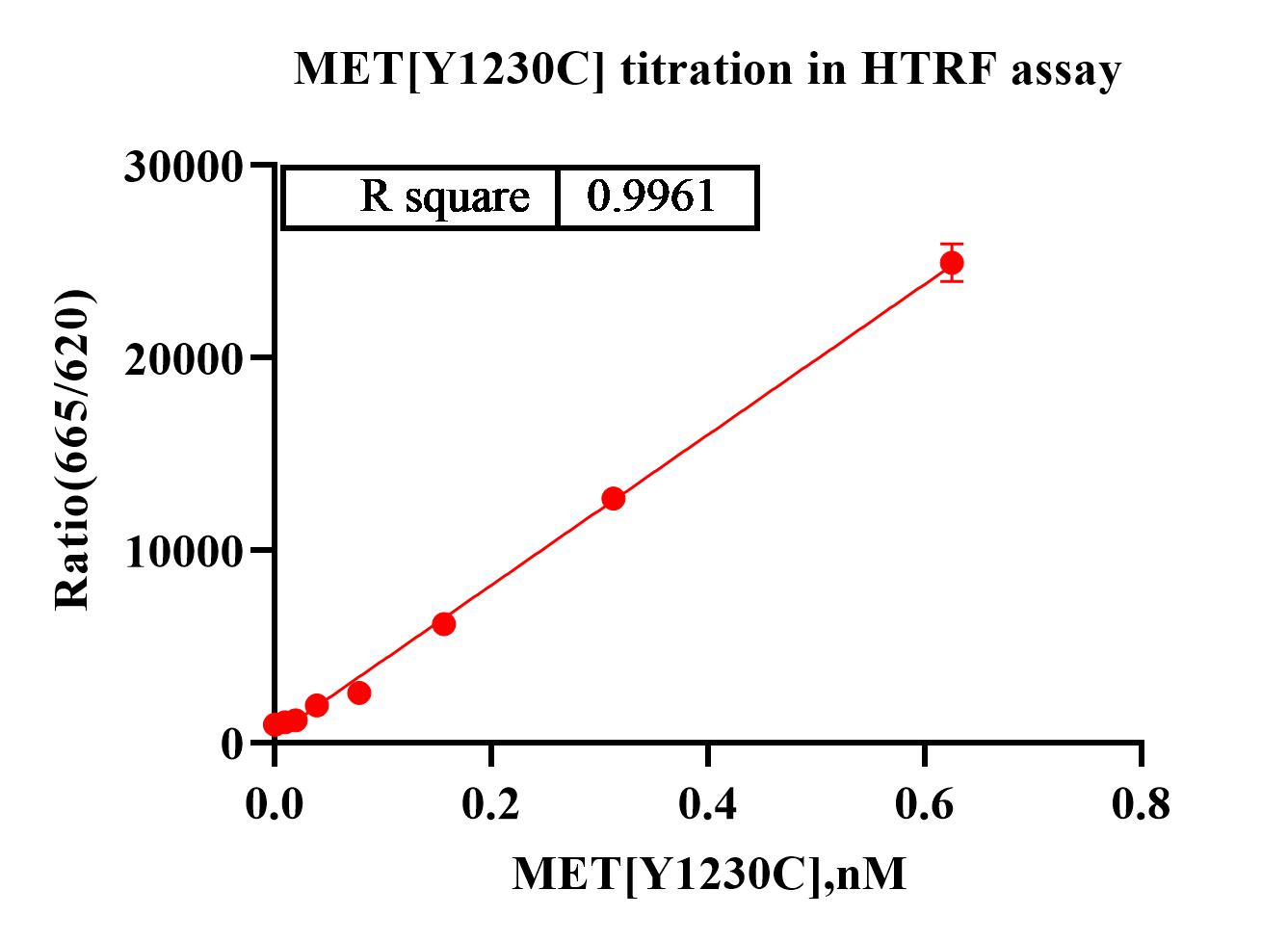 Activity Identification:The MET[Y1230C] activity was detected using HTRF technology. The reaction was performed by incubating the MET[Y1230C] protein, ATP and substrate at 25℃ for 60 min, adding the beads at 25℃ for 60 min, then reading ratio 665/620 with BMG.