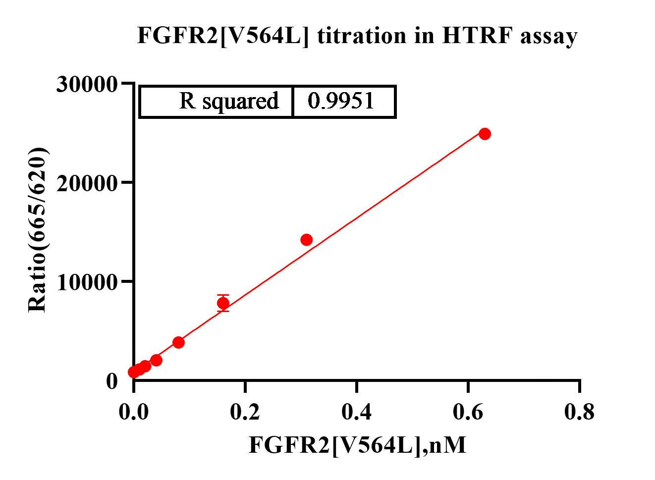 Description:Recombinant human FGFR2[V564L] protein with N-terminal GST tag was purified by GST affinity and followed by SEC chromatogaphy. The FGFR2[V564L] protein showed high activity in HTRF assay.