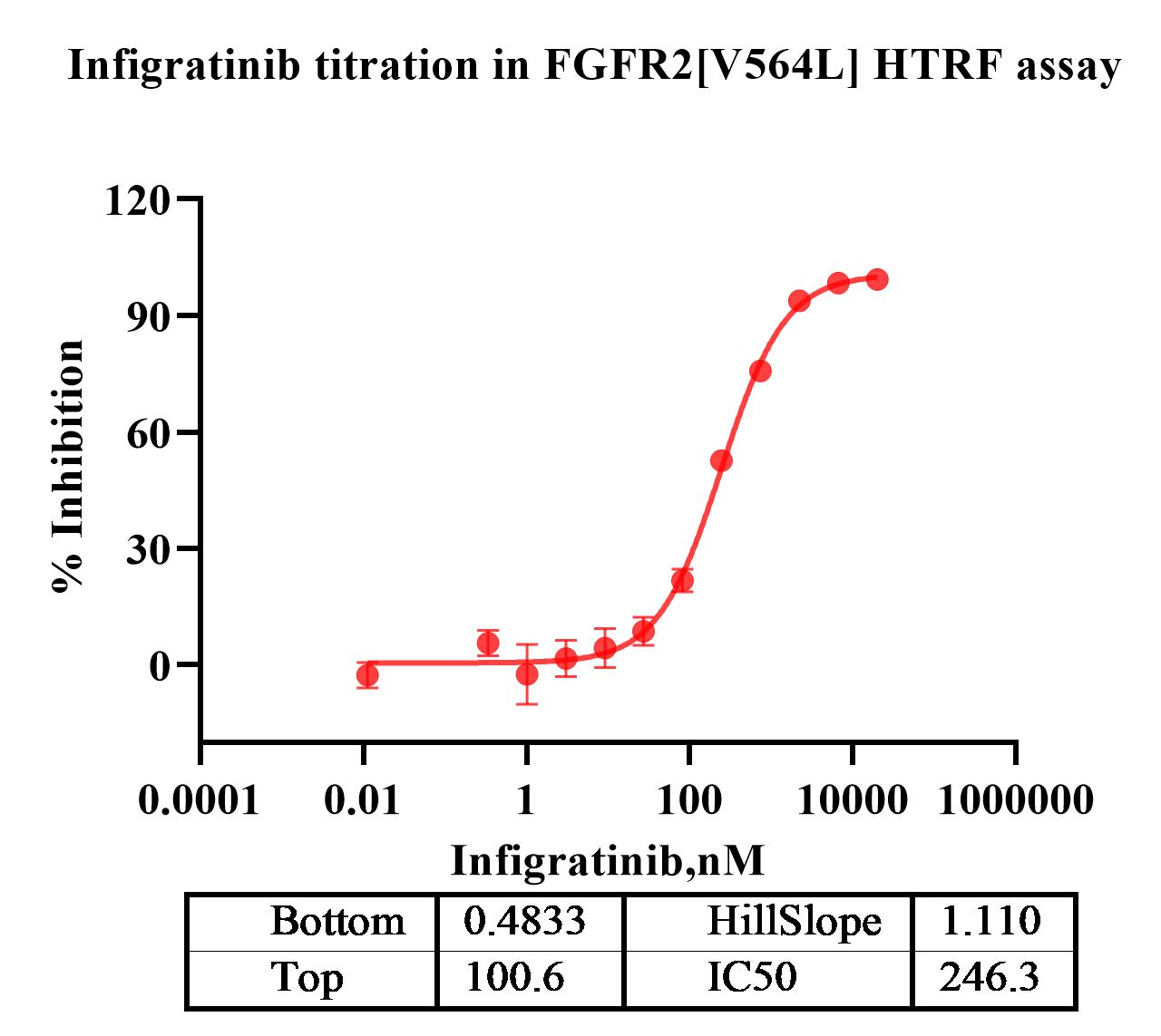 Activity Identification:The FGFR2[V564L] activity was detected using HTRF technology. The reaction was performed by incubating the FGFR2 [V564L] protein, ATP and substrate at 25℃ for 60 min, adding the beads at 25℃ for 60 min, then reading ratio 665/620 with BMG.