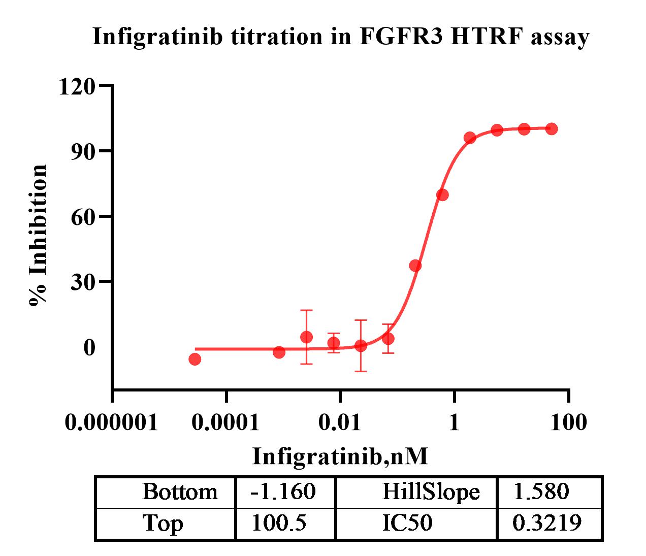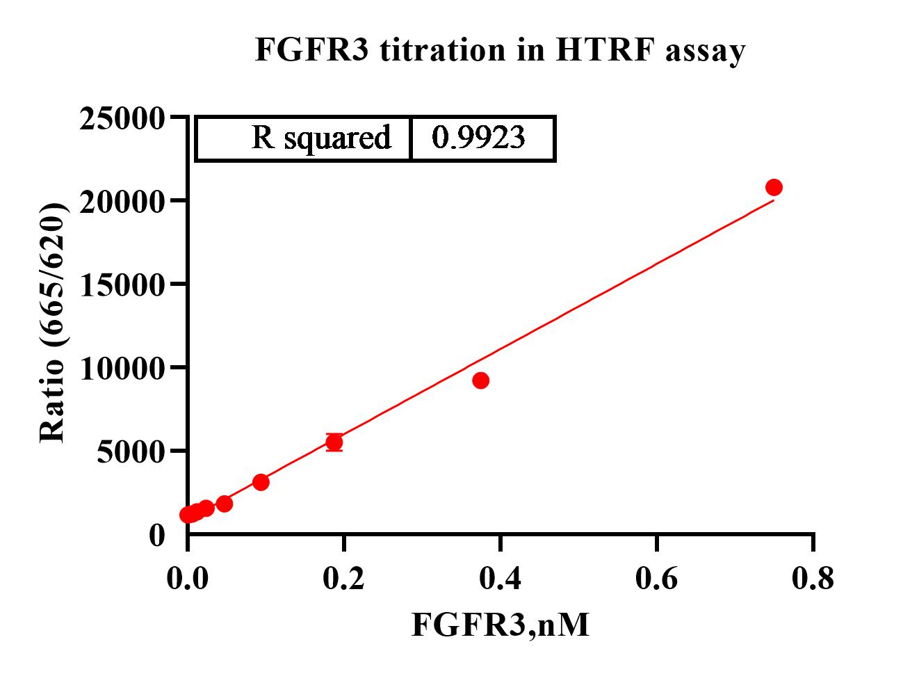 Activity Identification:The FGFR3 activity was detected using HTRF technology. The reaction was performed by incubating the FGFR3 protein, ATP and substrate at 25℃ for 60 min, then reading ratio 665/620 with BMG.