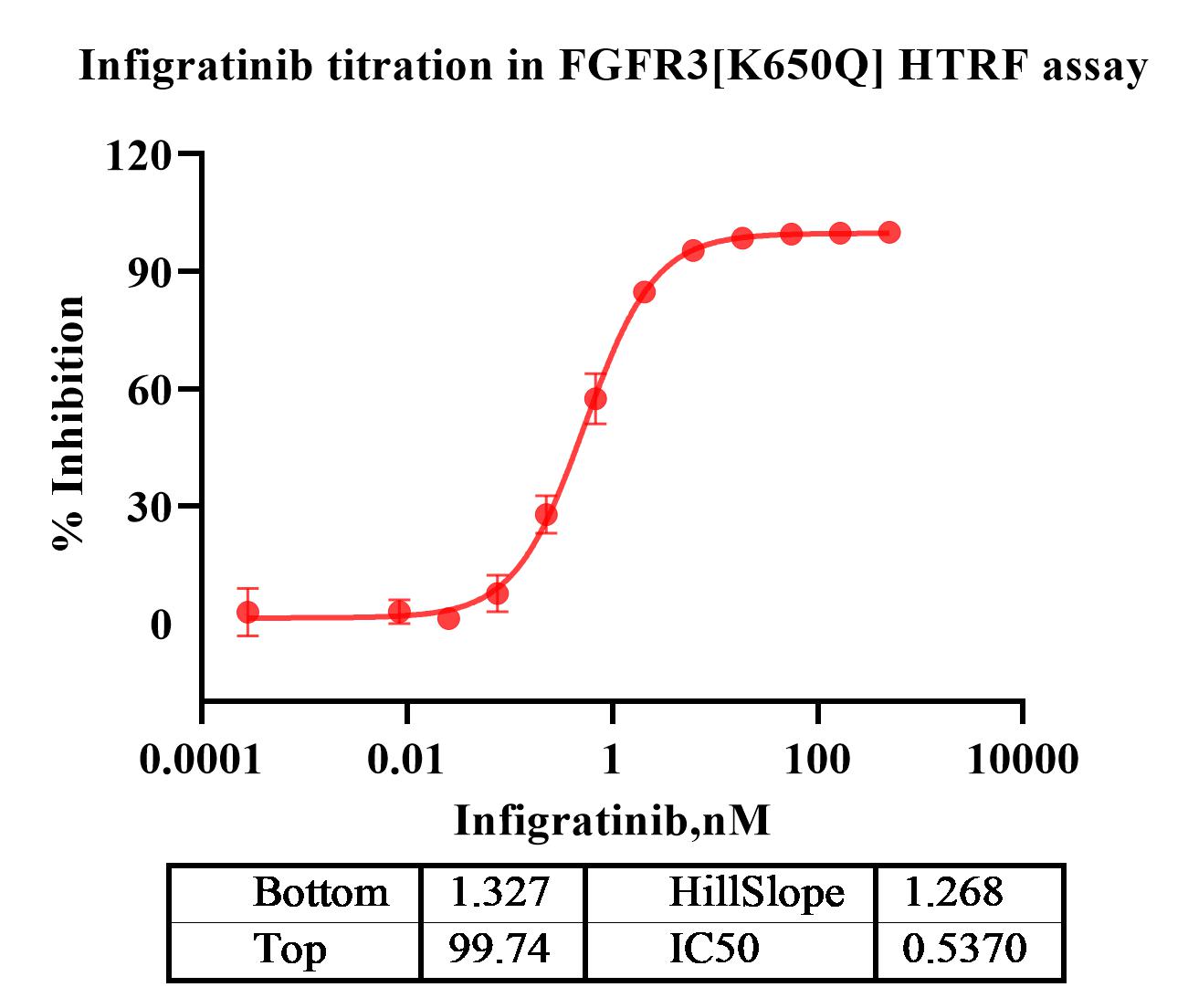 Activity Identification:The FGFR3[K650Q] activity was detected using HTRF technology. The reaction was performed by incubating the FGFR3[K650Q] protein, ATP and substrate at 25℃ for 60 min, then reading ratio 665/620 with BMG.