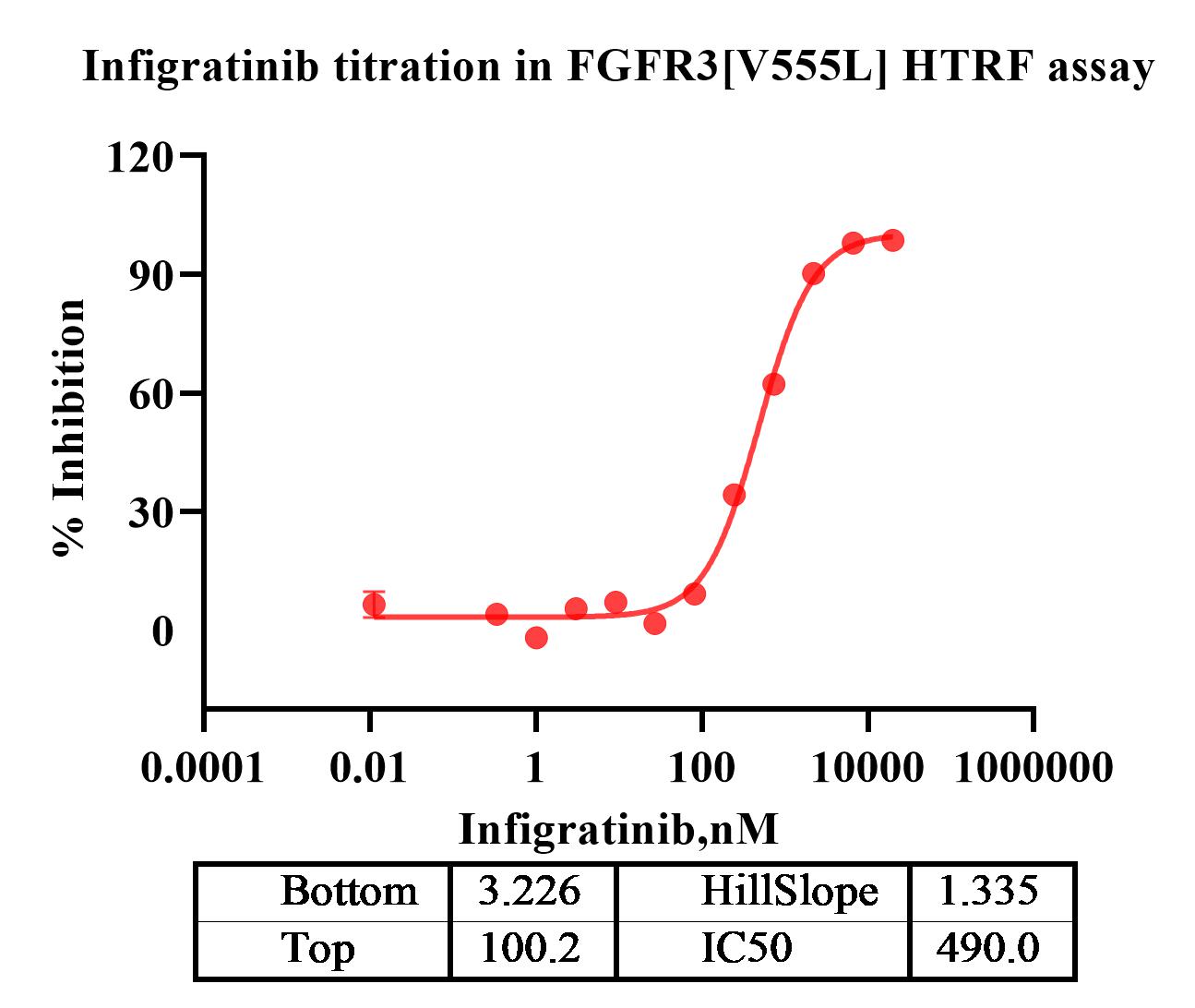 Activity Identification:The FGFR3[V555L] activity was detected using HTRF technology. The reaction was performed by incubating the FGFR3[V555L] protein, ATP and substrate at 25℃ for 60 min, adding the beads at 25℃ for 60 min, then reading ratio 665/620 with BMG.