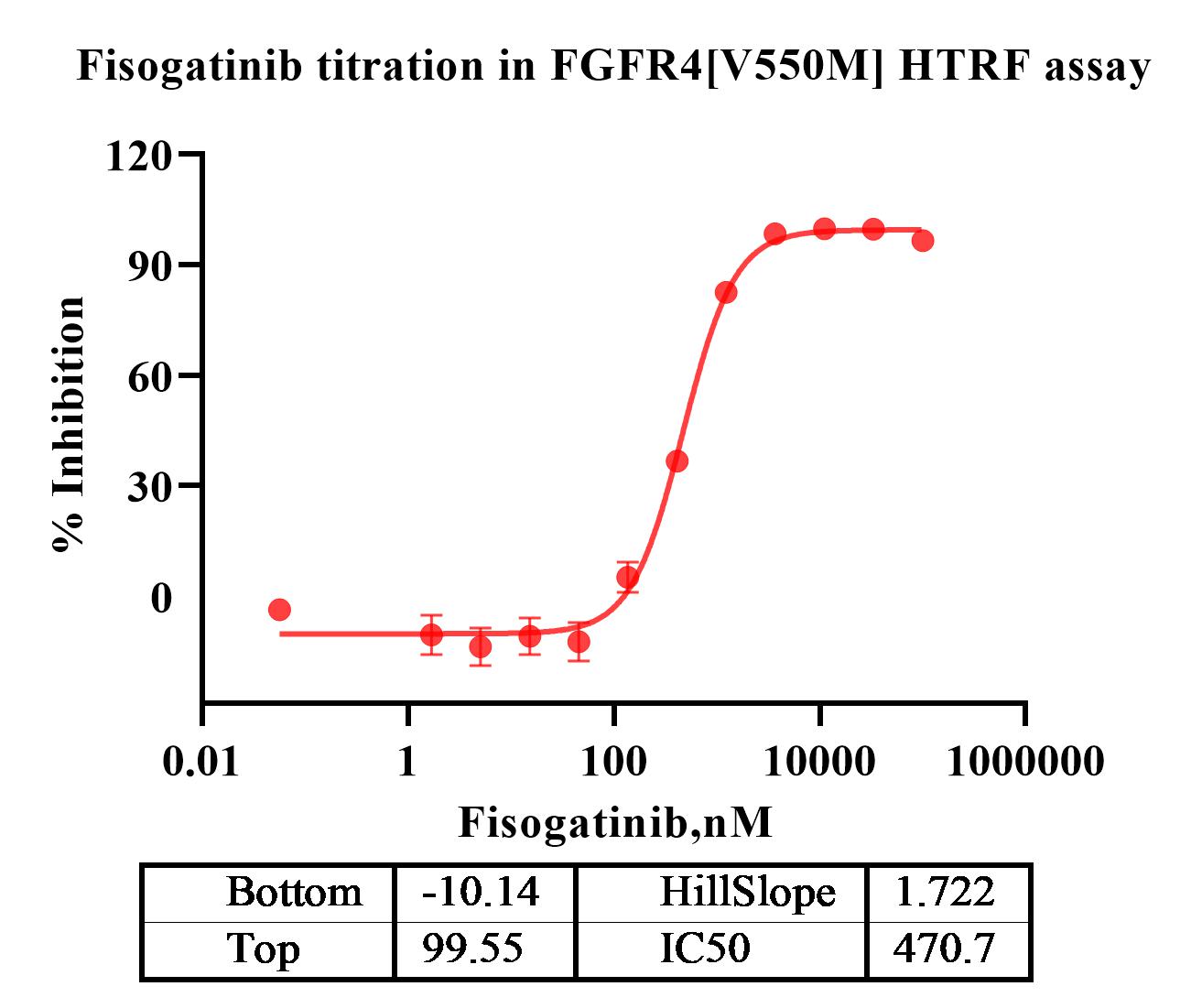 Activity Identification:The FGFR4[V550M] activity was detected using HTRF technology. The reaction was performed by incubating the FGFR4[V550M] protein, ATP and substrate at 25℃ for 60 min, adding the beads at 25℃ for 60 min, then reading ratio 665/620 with BMG.