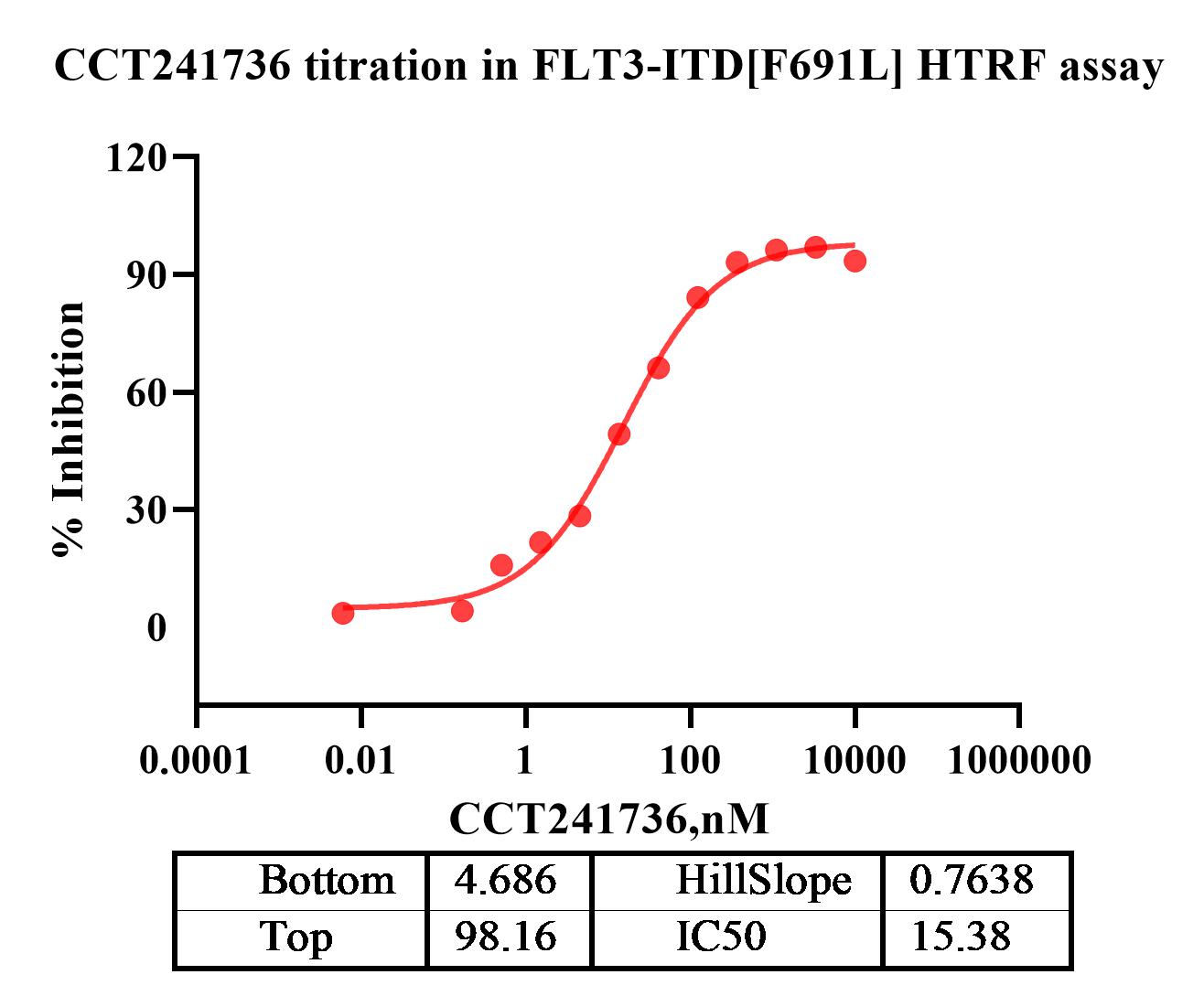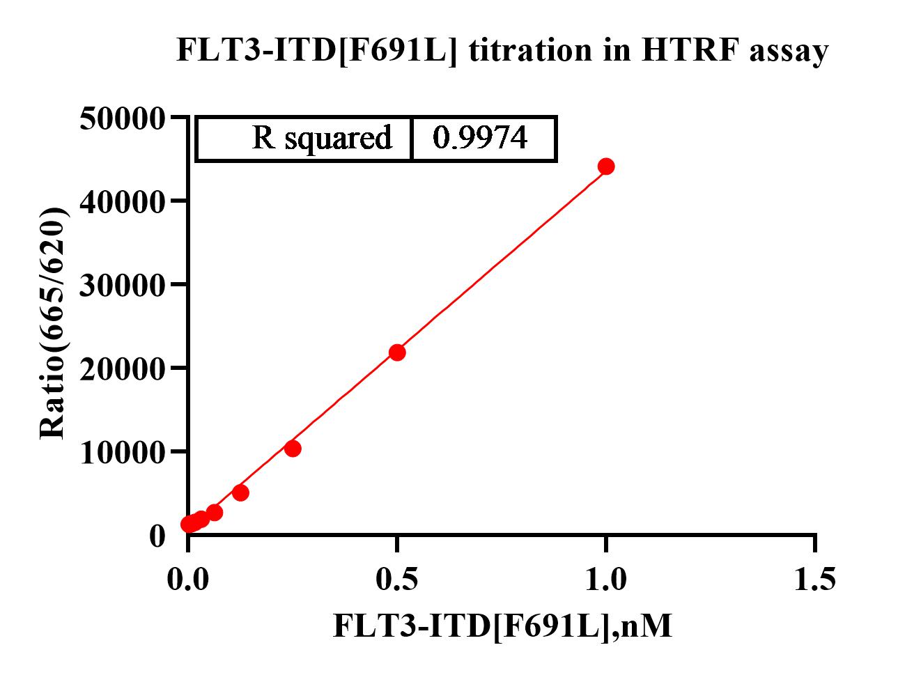 Activity Identification:The FLT3-ITD[F691L] activity was detected using HTRF technology. The reaction was performed by incubating the FLT3-ITD[F691L] protein, ATP and substrate at 25℃ for 60 min, adding the beads at 25℃ for 60 min, then reading ratio 665/620 with BMG.