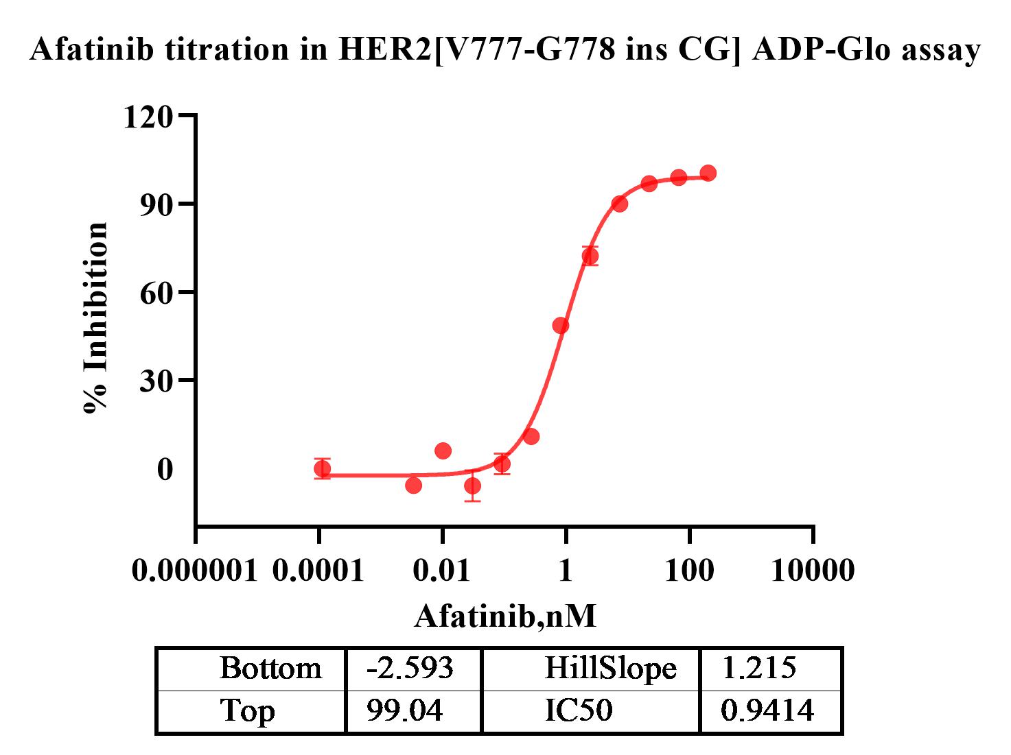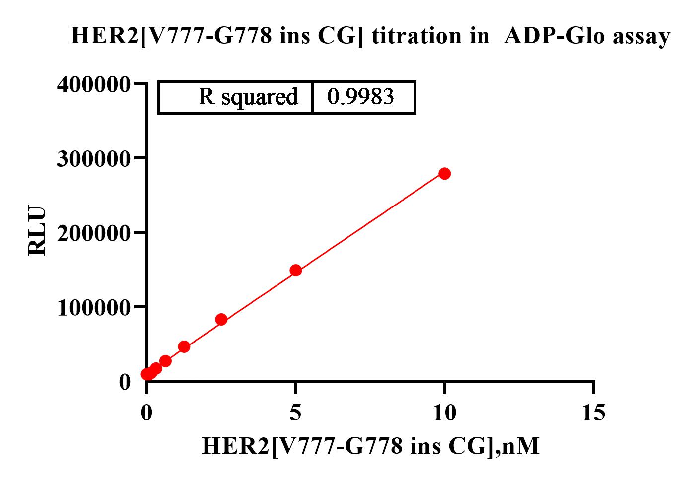 Activity Identification:The Her2 [V777-G778 ins CG] activity was detected using Ultra Luminescence technology. The reaction was performed by incubating the Her2 [V777-G778 ins CG] protein, ATP and substrate at 25℃ for 60 min, then adding ADP-Glo reagent and reading RLU signal with BMG.