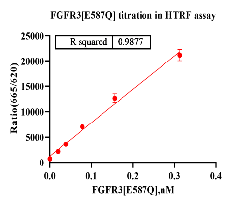 Activity Identification:The FGFR3[E587Q] activity was detected using HTRF technology. The reaction was performed by incubating the FGFR3[E587Q] protein, ATP and substrate at 25℃ for 60 min, adding the beads at 25℃ for 60 min, then reading ratio 665/620 with BMG.