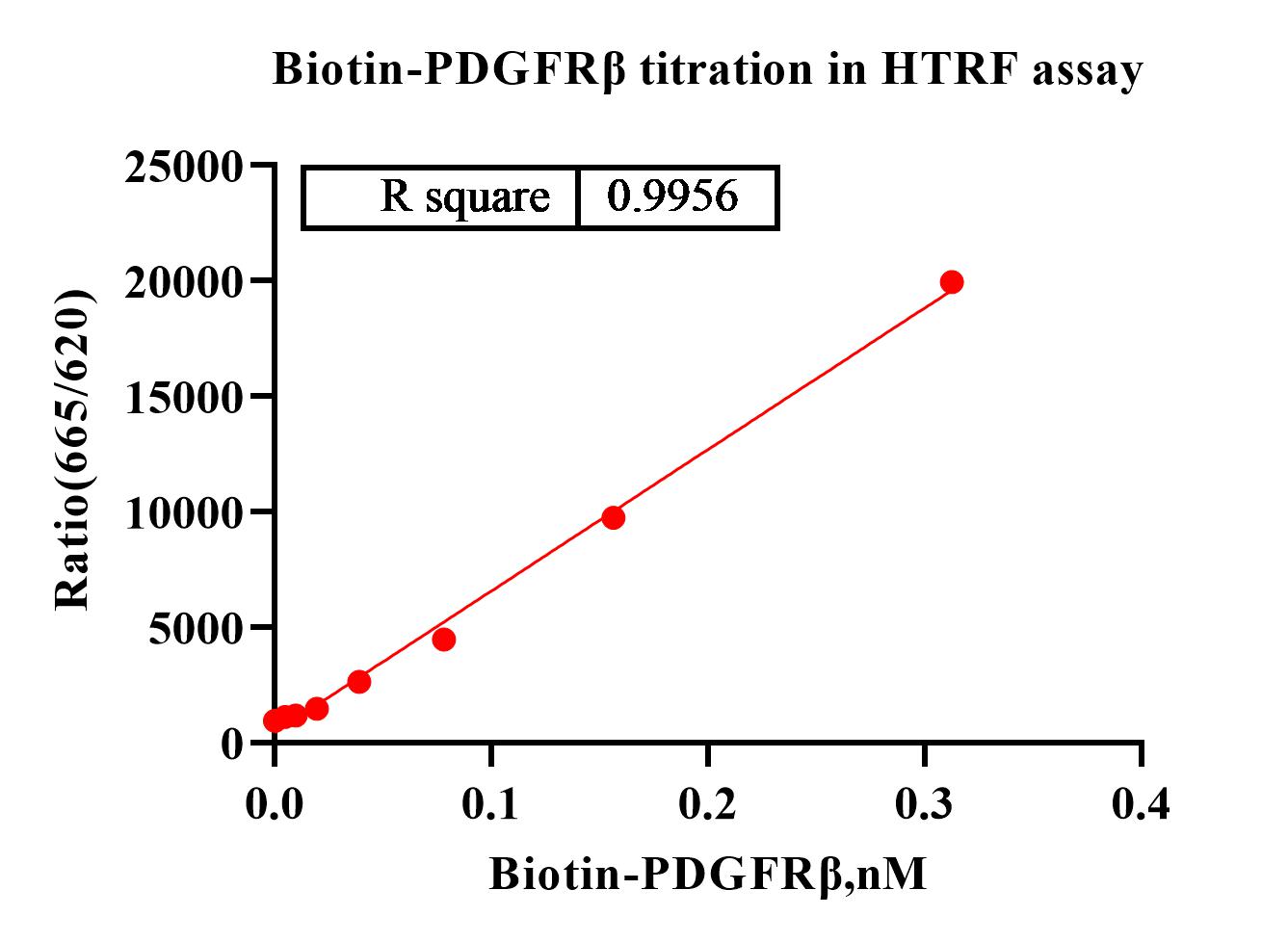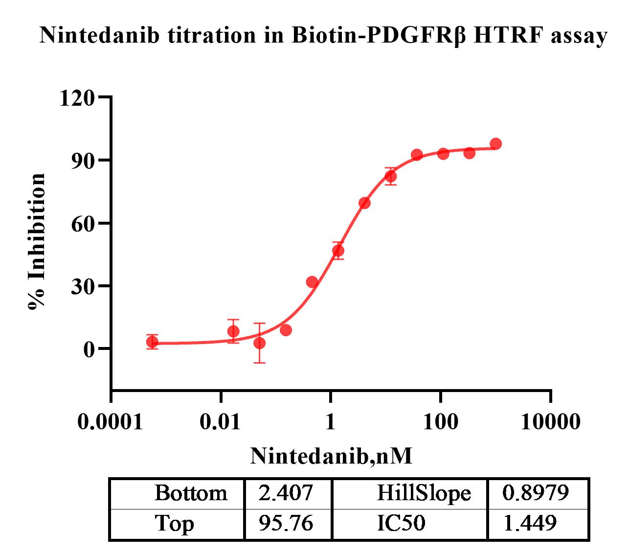 Activity Identification:The Biotin-PDGFRβ activity was detected using HTRF technology. The reaction was performed by incubating the Biotin-PDGFRβ protein, ATP and substrate at 25℃ for 60 min, adding the beads at 25℃ for 60 min, then reading ratio 665/620 with BMG.