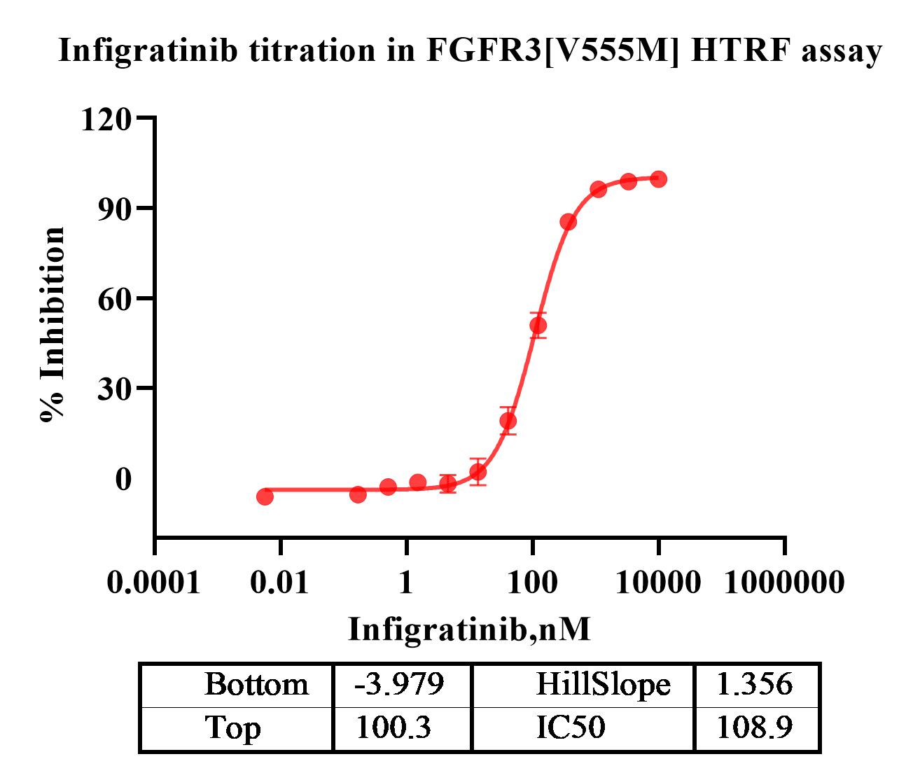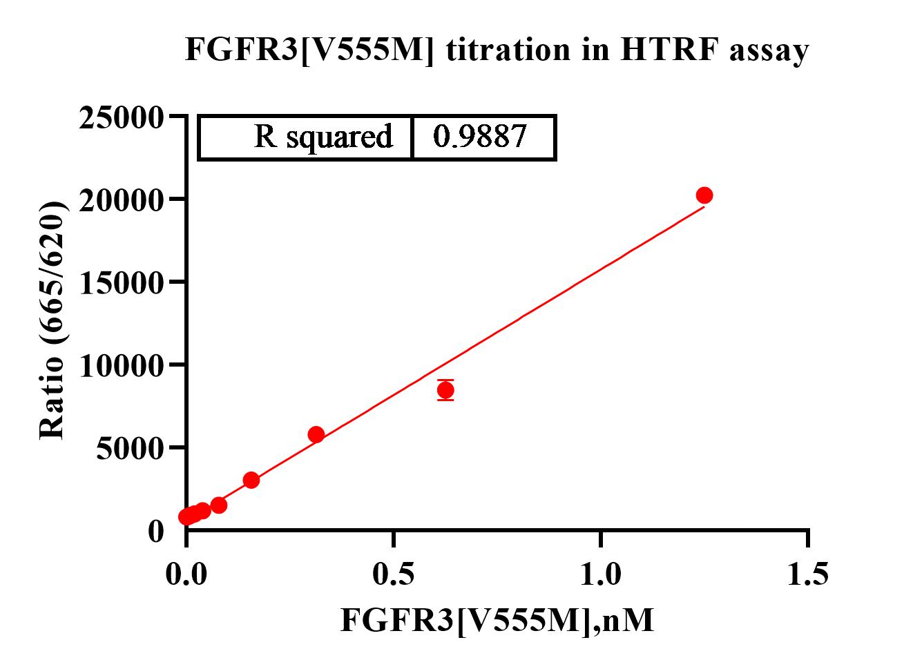 Activity Identification:The FGFR3[V555M] activity was detected using HTRF technology. The reaction was performed by incubating the FGFR3[V555M] protein, ATP and substrate at 25℃ for 60 min, then reading ratio 665/620 with BMG.