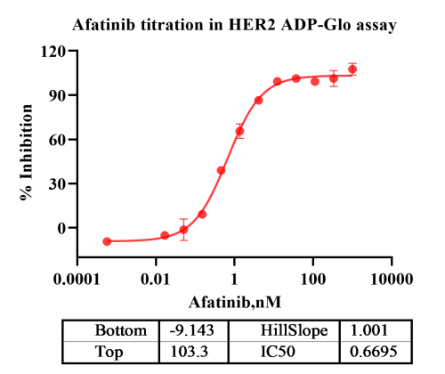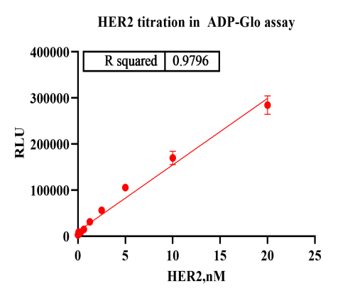 Activity Identification:The HER2 activity was detected using Ultra Luminescence technology. The reaction was performed by incubating the HER2 protein, ATP and substrate at 25℃ for 60 min, then adding ADP-Glo reagent and reading RLU signal with BMG.