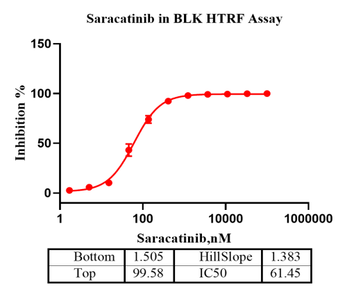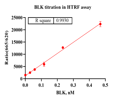 Activity Identification:The BLK activity was detected using HTRF technology. The reaction was performed by incubating the BLK protein, ATP and substrate at 25℃ for 60 min, adding the beads at 25℃ for 60 min, then reading ratio 665/620 with BMG.