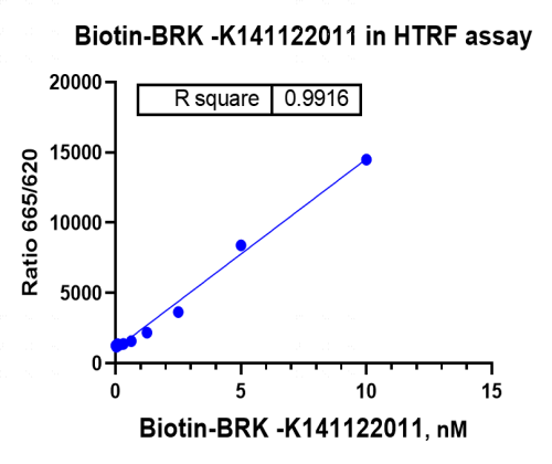 Activity Identification:The Biotin-BRK kinase activity was quantified using a HTRF-based assay. The reaction was performed by incubating the Biotin-BRK protein, ATP and substrate at 25℃ for 60 min, then adding the donor and receptor, and keeping the mixture at 25℃ for 60 min, finally measuring the 665nm/620nm fluorescence signal ratio on BMG.
