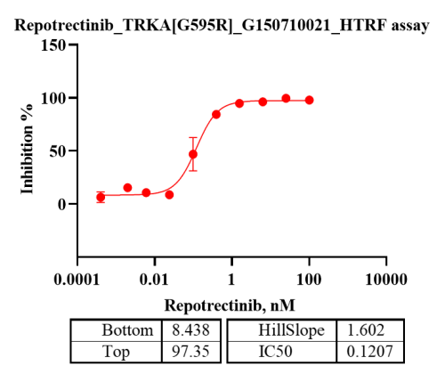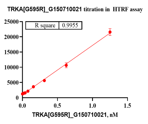 Activity Identification:The TRKA[G595R] activity was quantified using a HTRF-based assay. The reaction was performed by incubating the TRKA[G595R] protein, ATP and substrate at 25℃ for 60 min, then adding the donor and receptor, and keeping the mixture at 25℃ for 60 min, finally measuring the 665nm/620nm fluorescence signal ratio on BMG.