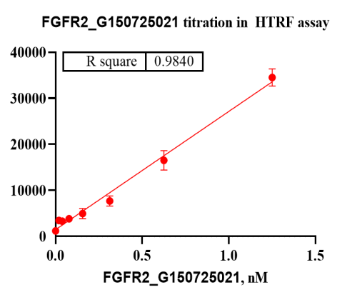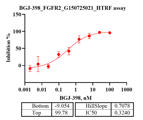 Activity Identification:The FGFR2 activity was quantified using a HTRF-based assay. The reaction was performed by incubating the FGFR2 protein, ATP and substrate at 25℃ for 60 min, then adding the donor and receptor, and keeping the mixture at 25℃ for 60 min, finally measuring the 665nm/620nm fluorescence signal ratio on BMG.