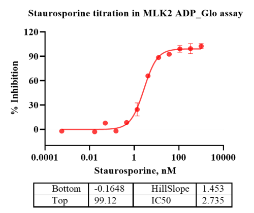 Activity Identification:The Biotin-MLK2 activity was detected using Ultra Luminescence technology. The reaction was performed by incubating the Biotin-MLK2 protein, ATP and substrate at 25℃ for 60 min, then adding ADP-Glo reagent and reading RLU signal with BMG.