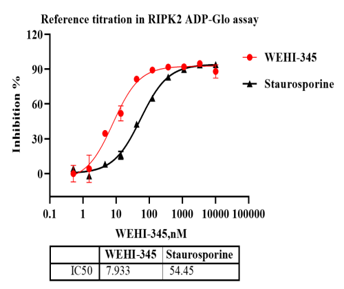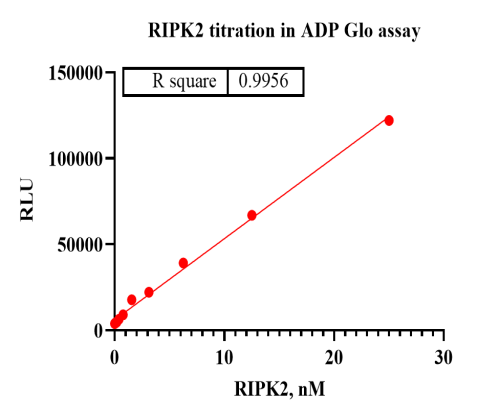 Activity Identification:The RIPK2 activity was detected using Ultra Luminescence technology. The reaction was performed by incubating the RIPK2 protein, ATP and substrate at 25℃ for 180 min, then adding ADP-Glo reagent and reading RLU signal with BMG.