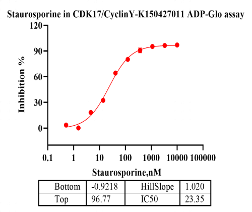 Activity Identification:The CDK17/CyclinY activity was detected using Ultra Luminescence technology. The reaction was performed by incubating the CDK17/CyclinY protein, ATP and substrate at 25℃ for 60 min, then adding ADP-Glo reagent and reading RLU signal with BMG.