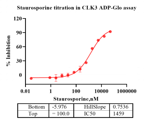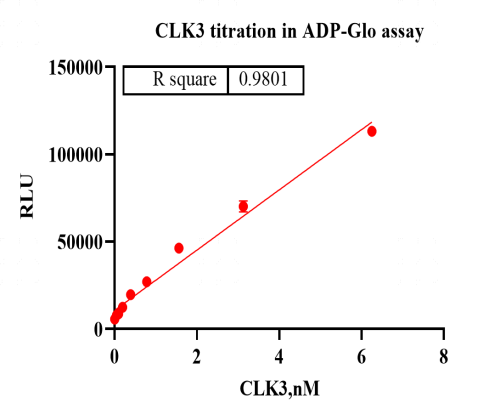 Activity Identification:The CLK3 activity was detected using Ultra Luminescence technology. The reaction was performed by incubating the CLK3 protein, ATP and substrate at 25℃ for 60 min, then adding ADP-Glo reagent and reading RLU signal with BMG.