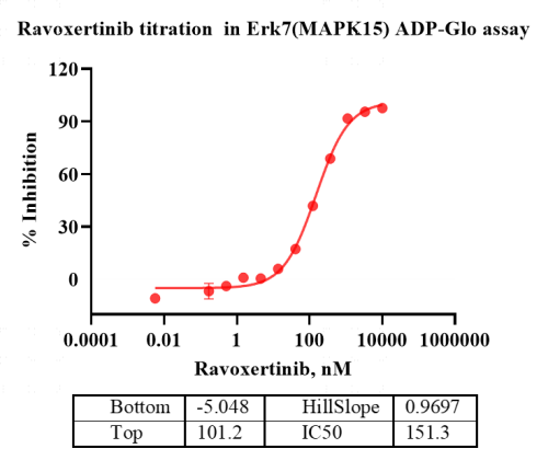 Activity Identification:The Erk7 activity was detected using Ultra Luminescence technology. The reaction was performed by incubating the Erk7 protein, ATP and substrate at 25℃ for 60 min, then adding ADP-Glo reagent and reading RLU signal with BMG.