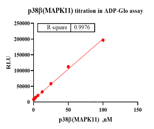Activity Identification:The p38β(MAPK11) activity was detected using Ultra Luminescence technology. The reaction was performed by incubating the p38β(MAPK11) protein , ATP and substrate at 25℃ for 60 min, then adding ADP-Glo reagent and reading RLU with BMG.