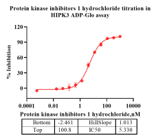 Activity Identification:The HIPK3 activity was detected using Ultra Luminescence technology. The reaction was performed by incubating the HIPK3 protein, ATP and substrate at 25℃ for 60 min, then adding ADP-Glo reagent and reading RLU signal with BMG.