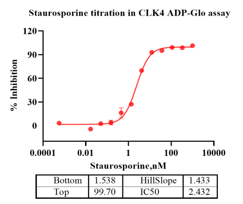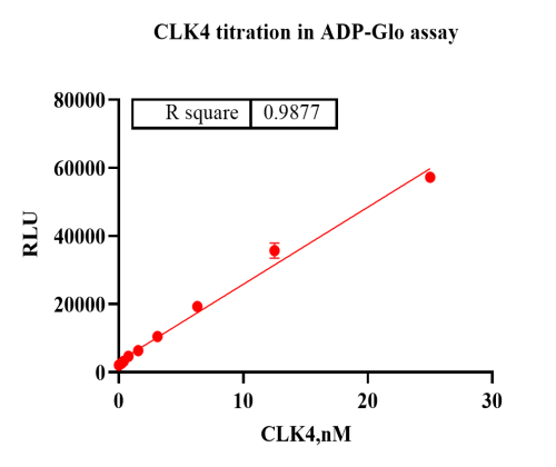 Activity Identification:The CLK4 activity was detected using Ultra Luminescence technology. The reaction was performed by incubating the CLK4 protein, ATP and substrate at 25℃ for 60 min, then adding ADP-Glo reagent and reading RLU signal with BMG.