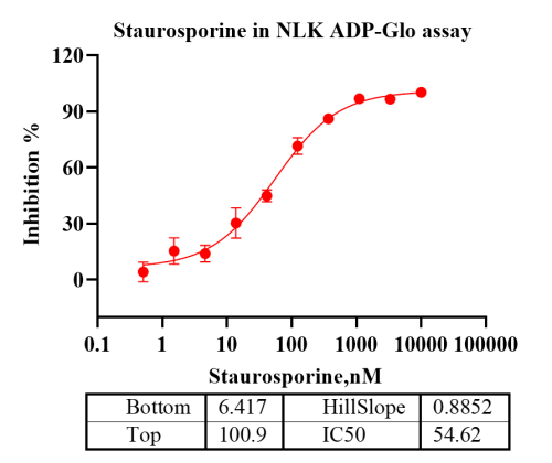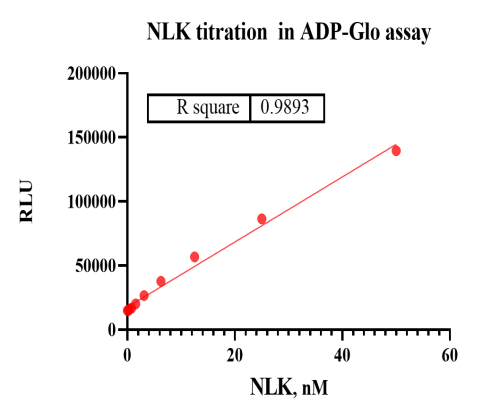 Activity Identification:The NLK activity was detected using Ultra Luminescence technology. The reaction was performed by incubating the NLK protein, ATP and substrate at 25℃ for 60 min, then adding ADP-Glo reagent and reading RLU signal with BMG.
