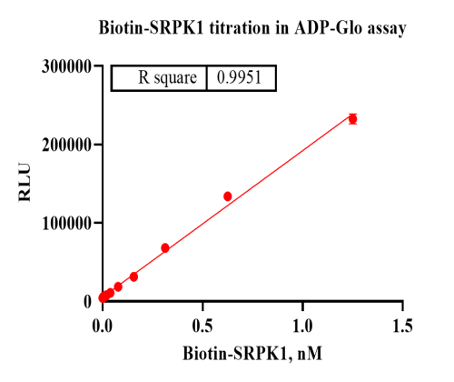 Activity Identification:The Biotin-SRPK1 activity was detected using Ultra Luminescence technology. The reaction was performed by incubating the Biotin-SRPK1 protein, ATP and substrate at 25℃ for 60 min, then adding ADP-Glo reagent and reading RLU signal with BMG.