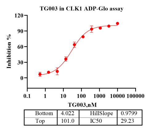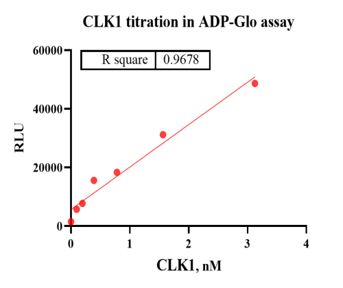Activity Identification:The CLK1 activity was detected using Ultra Luminescence technology. The reaction was performed by incubating the CLK1 protein, ATP and substrate at 25℃ for 60 min, then adding ADP-Glo reagent and reading RLU with BMG.