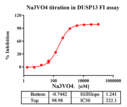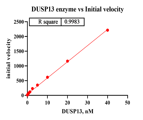 Activity Identification:The DUSP13 activity was detected by cleaving the fluorogenic peptide substrate in FI assay. The reaction was performed by incubating the DUSP13 protein and substrate at 25℃ for 30 min, then reading RFU with BMG.
