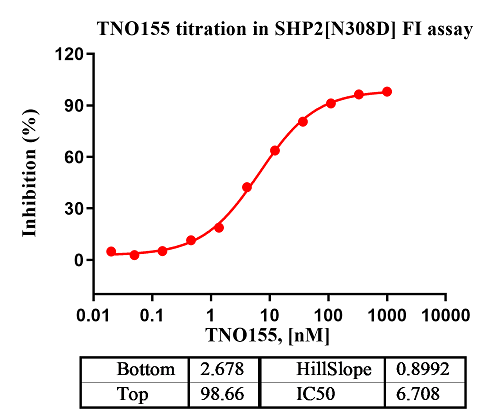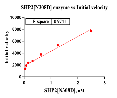 Activity Identification:The SHP2[N308D] activity was detected by cleaving the fluorogenic peptide substrate in FI assay. The reaction was performed by incubating the SHP2[N308D] protein and substrate at 25℃ for 30 min, then reading RFU with BMG.