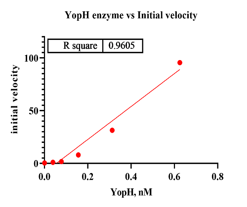 Activity Identification:The YopH activity was detected by cleaving the fluorogenic peptide substrate in FI assay. The reaction was performed by incubating the YopH protein and substrate at 25℃ for 60 min, then reading RFU with BMG.