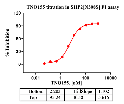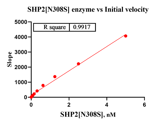 Activity Identification:The SHP2[N308S] activity was detected by cleaving the fluorogenic peptide substrate in FI assay. The reaction was performed by incubating the SHP2[N308S] protein and substrate at 25℃ for 30 min, then reading RFU with BMG.