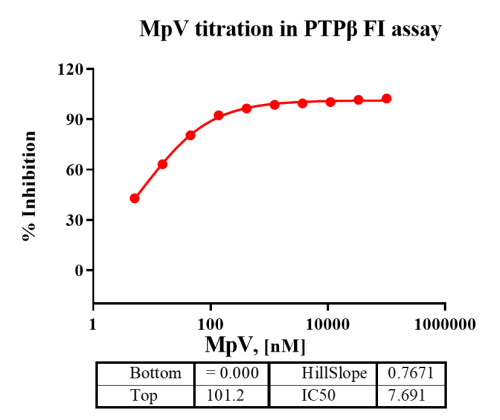 Activity Identification:The PTPβ activity was detected by cleaving the fluorogenic peptide substrate in FI assay. The reaction was performed by incubating the PTPβ protein and substrate at 25℃ for 60 min, then reading FI signal with BMG.