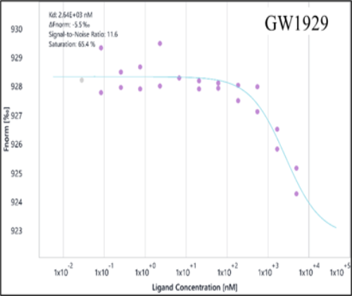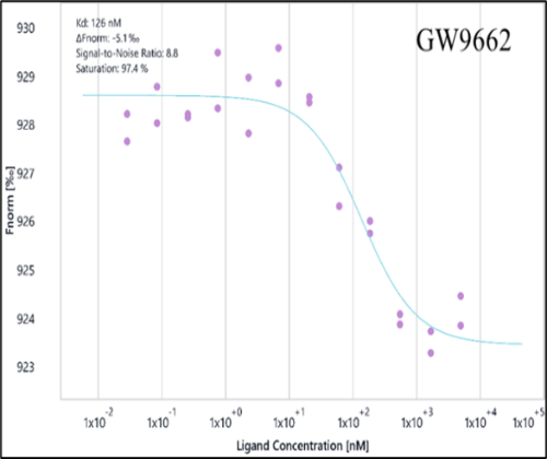 Activity Identification:The Biotin-PPARγ activity was quantified using special shift-based assay. The reaction was performed by incubating the Biotin-PPARγ protein labeled by dye and compound at 25℃ for 15min, then measuring 670/650nm fluorescence signal ratio on Dianthus.