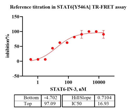 Activity Identification:The Biotin-STAT6[Y546A] activity was quantified using TR-FRET-based assay. The reaction was performed by incubating the Biotin-STAT6[Y546A] protein and substrate, the donor and receptor at 25℃ for 60 min, then measuring the 520nm/485nm fluorescence signal ratio on BMG.