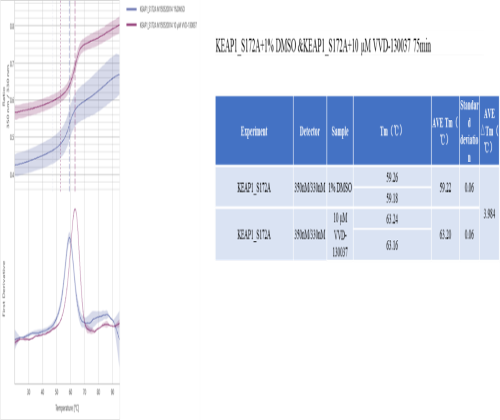 Activity Identification:The KEAP1[S172A] activity was quantified using nanoDSF assay. The reaction was performed by incubating the KEAP1[S172A] protein and 1%DMSO at 25℃ for 15 min, and then on PrometheusTM NT.48 heating the reaction mixture with the temperature range from 20℃ to 95℃, and real time measuring 350/330 nm fluorescence signal ratio.