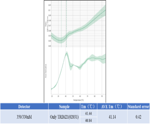 Activity Identification:The Biotin-TRIM21 activity was quantified using nanoDSF assay. The reaction was performed by incubating the Biotin-TRIM21 protein at 25℃ for 15 min, and then on PrometheusTM NT.48 heating the reaction mixture with the temperature range from 20℃ to 95℃, and real time measuring 350/330 nm fluorescence signal ratio.