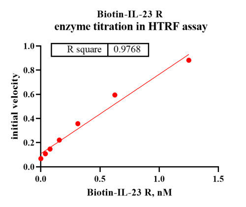 Activity Identification:The Biotin-IL23R activity was detected using HTRF technology. The reaction was performed by incubating the Biotin-IL23R protein and substrate, adding the beads and keeping the mixture at 25℃ for 60 min, then reading ratio 665/620 with BMG