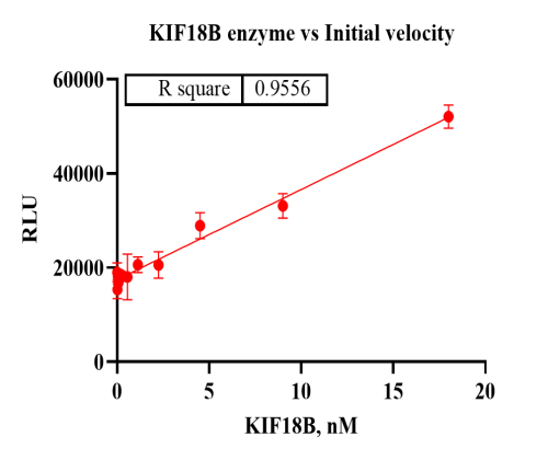 Activity Identification:The KIF18B activity was detected using Ultra Luminescence technology. The reaction was performed by incubating the KIF18B protein, ATP and substrate at 25℃ for 60 min, then adding ADP-Glo reagent and reading RLU with BMG.