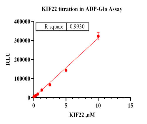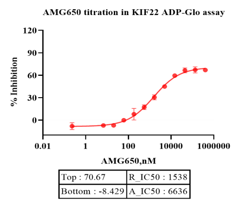 Activity Identification:The KIF22 activity was detected using Ultra Luminescence technology. The reaction was performed by incubating the KIF22 protein, ATP and substrate at 25℃ for 60 min, then adding ADP-Glo reagent at 25℃ for 40 min and reading RLU signal with BMG.