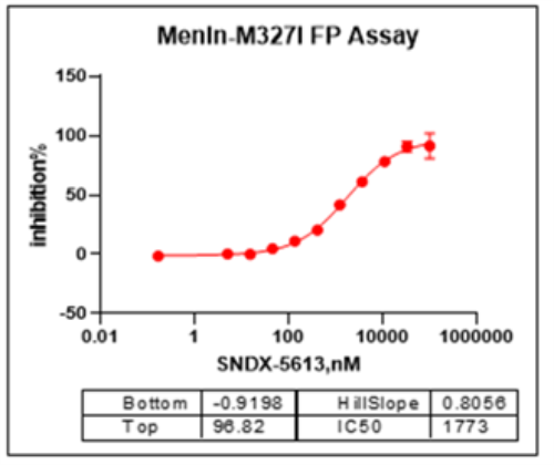 Activity Identification:The Menin[M327I] activity was assayed using FP technology. The reaction was performed by incubating the Menin[M327I] protein, substrate and varying concentration of SNDX-5613 at 25℃ for 40 min, then reading fluorescence intensity ratio at 490 nm and 520 nm wavelength on BMG.