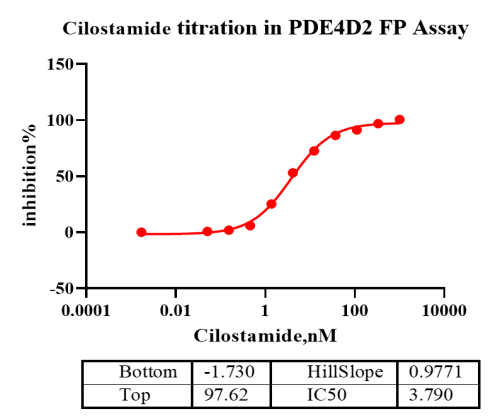 Activity Identification:The PDE4D2 activity was assayed by FP technology. The reaction was performed by incubating the PDE4D2 protein, substrate at 25℃ for 60 min, and adding the binding agent at 25℃ for 60 min, then reading FP signal with BMG.