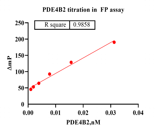 Activity Identification:The PDE4B2 activity was detected using FP technology. The reaction was performed by incubating the PDE4B2 protein and cAMP at 25℃ for 60 min, then adding detection reagent at 25℃ for 60 min and reading FP signal with BMG.