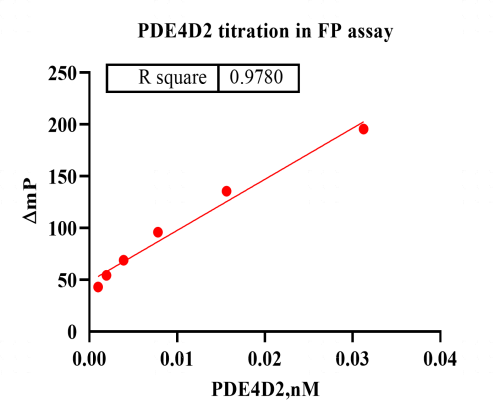 Activity Identification:The PDE4D2 activity was detected using FP technology. The reaction was performed by incubating the PDE4D2 protein and cAMP at 25℃ for 60 min, then adding detection reagent at 25℃ for 60 min and reading FP signal with BMG.