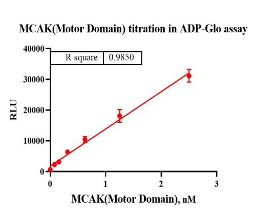 Activity Identification:The MCAK(Motor Domain) activity was detected using Ultra Luminescence technology. The reaction was performed by incubating the MCAK(Motor Domain) protein, ATP and MTS at 25℃ for 60 min, then adding ADP-Glo reagent and reading RLU signal with BMG.