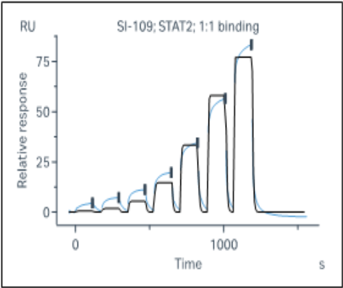 Activity Identification:The STAT2 activity was detected using SPR technology. The STAT2 protein was immobilized onto the CM5 chip. The varying concentration of SI-109 was injected onto the STAT2 protein surface, and recorded the response signal. The kinetics fitting was as follows with a kD value of ~ 1.95x10-6 M.
